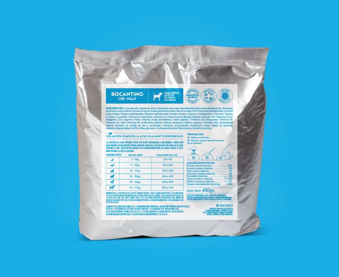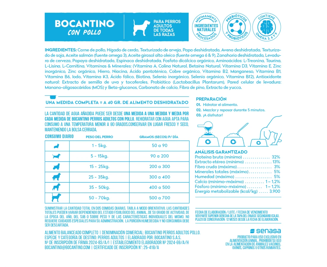 La cantidad de agua añadida puede ser desde una medida a una medida y media por cada medida de Bocantino Perros Adultos con pollo. Rehidratar con agua apta para consumo a una temperatura menor a 80 grados. conservar en lugar fresco y seco, manteniendo la bolsa cerrada.