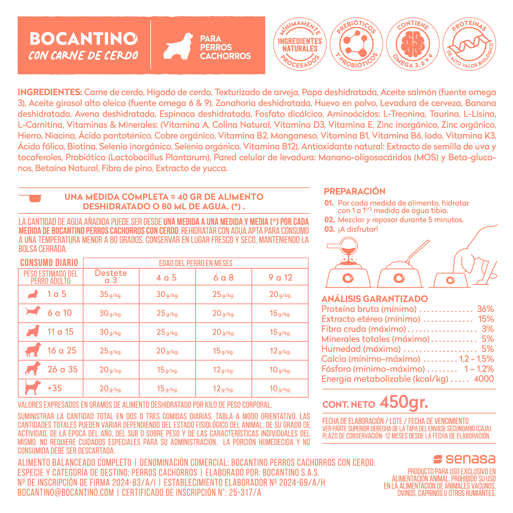 Por cada medida de alimento, hidratación 1 a 1 y ½ medida de agua tibia.