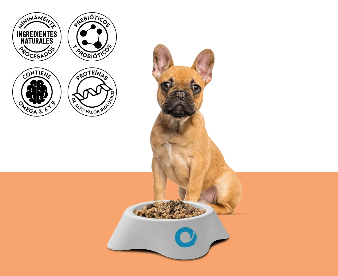 Carne de cerdo, Hígado de cerdo, Texturizado de arveja, Papa deshidratada, Avena deshidratada, Texturizado de soja, Aceite salmón (fuente omega 3), Aceite girasol alto oleico (fuente omega 6 & 9), Zanahoria deshidratada, Levadura de cerveza, Zapallo deshidratado, Manzana deshidratada, Espinaca deshidratada, Fosfato dicálcico, Aminoácidos: L-Treonina, Taurina, L-Lisina, L-Carnitina, Vitaminas & Minerales: (Vitamina A, Colina natural, Vitamina D3, Vitamina E, Zinc inorgánico, Zinc orgánico, Hierro, Niacina, Ácido pantoténico, Cobre orgánico, Vitamina B2, Manganeso, Vitamina B1, Vitamina B6, Iodo, Vitamina K3, Ácido fólico, Biotina, Selenio inorgánico, Selenio orgánico, Vitamina B12), Antioxidante natural: Extracto de semilla de uva y tocoferoles, Probiótico (Lactobacillus Plantarum), Pared celular de levadura: Manano-oligosacaridos (MOS) y Beta-glucanos, Carbonato de calcio, Betaína natural, Fibra de pino, Extracto de yucca.
