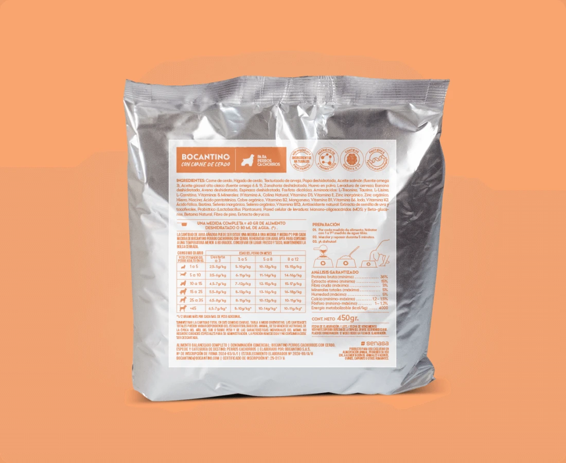 La mezcla incluye hígado de cerdo, huevo, papa, y es complementada con zanahoria, espinaca y arándanos, aportando un balance de nutrientes esenciales para una alimentación completa. Además, incorpora aceites de salmón y girasol, que son ricos en ácidos grasos omega 3, 6 y 9, contribuyendo a una piel y pelaje saludables.
